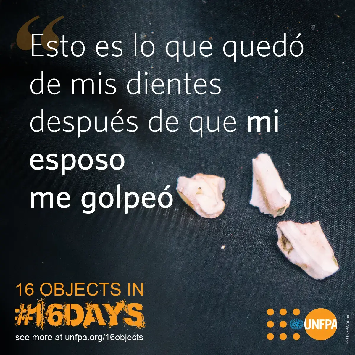 “Eso es lo único que quedó de mis dientes después de haber sido golpeada por mi esposo,” comenta Ameera*, una víctima de violencia que se encuentra en un albergue para mujeres en la región suroeste de Yemen.