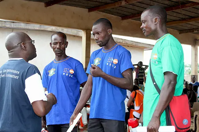 Kouassi Ernest Krah (centre) and his colleagues spoke with men about how family planning can improve women’s health. They also encouraged condom use to prevent sexually transmitted infections. © UNFPA Côte d'Ivoire