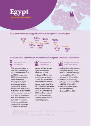 The 2023 Annual Report for the UNFPA-UNICEF Joint Programme on the Elimination of Female Genital Mutilation includes snapshots of 17 focus countries. Each snapshot offers a brief synopsis of the context, including drivers, prevalence, attitudes and progress in eliminating FGM, and a list of key programme partners. The snapshots also highlight key programmatic achievements and an activity showcasing how Phase IV of the programme operates at the field level. The main data sources are the UNFPA FGM dashboard and UNICEF’s “FGM Evidence Brief with Data."
