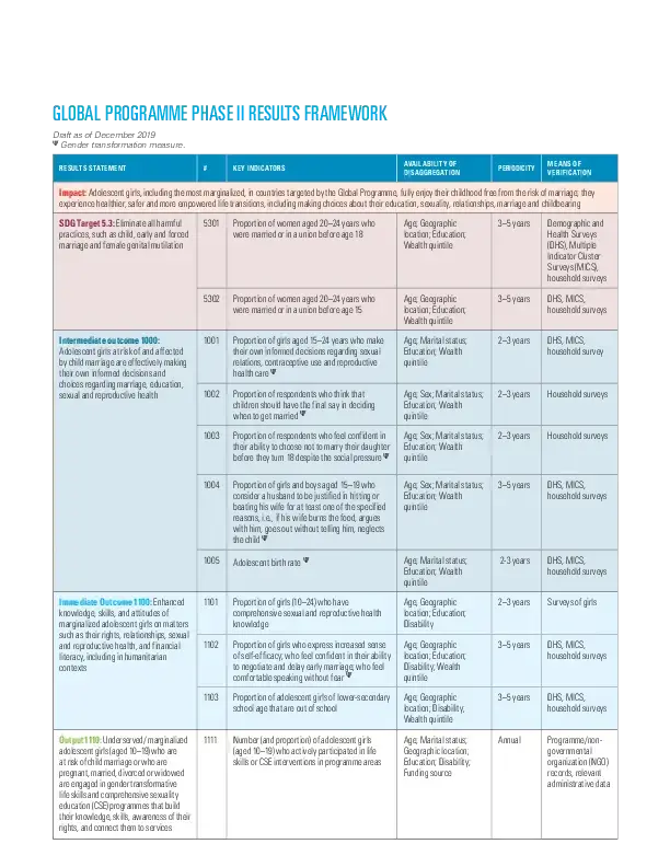 This document shows the results framework for Phase II of the UNFPA-UNICEF Global Programme to End Child Marriage.