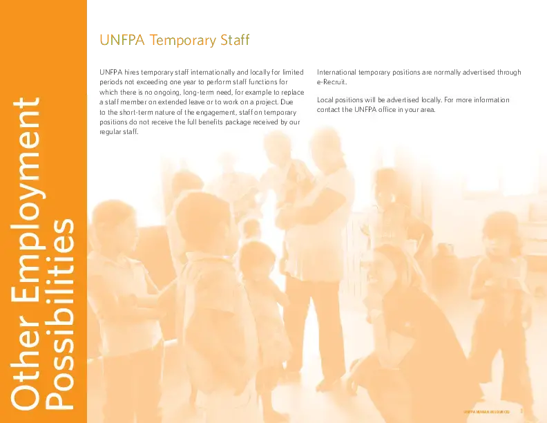In addition to UNFPA's staff positions, there are a variety of other opportunities available at UNFPA. These include internships, service contracts, consultancies and volunteer programmes.