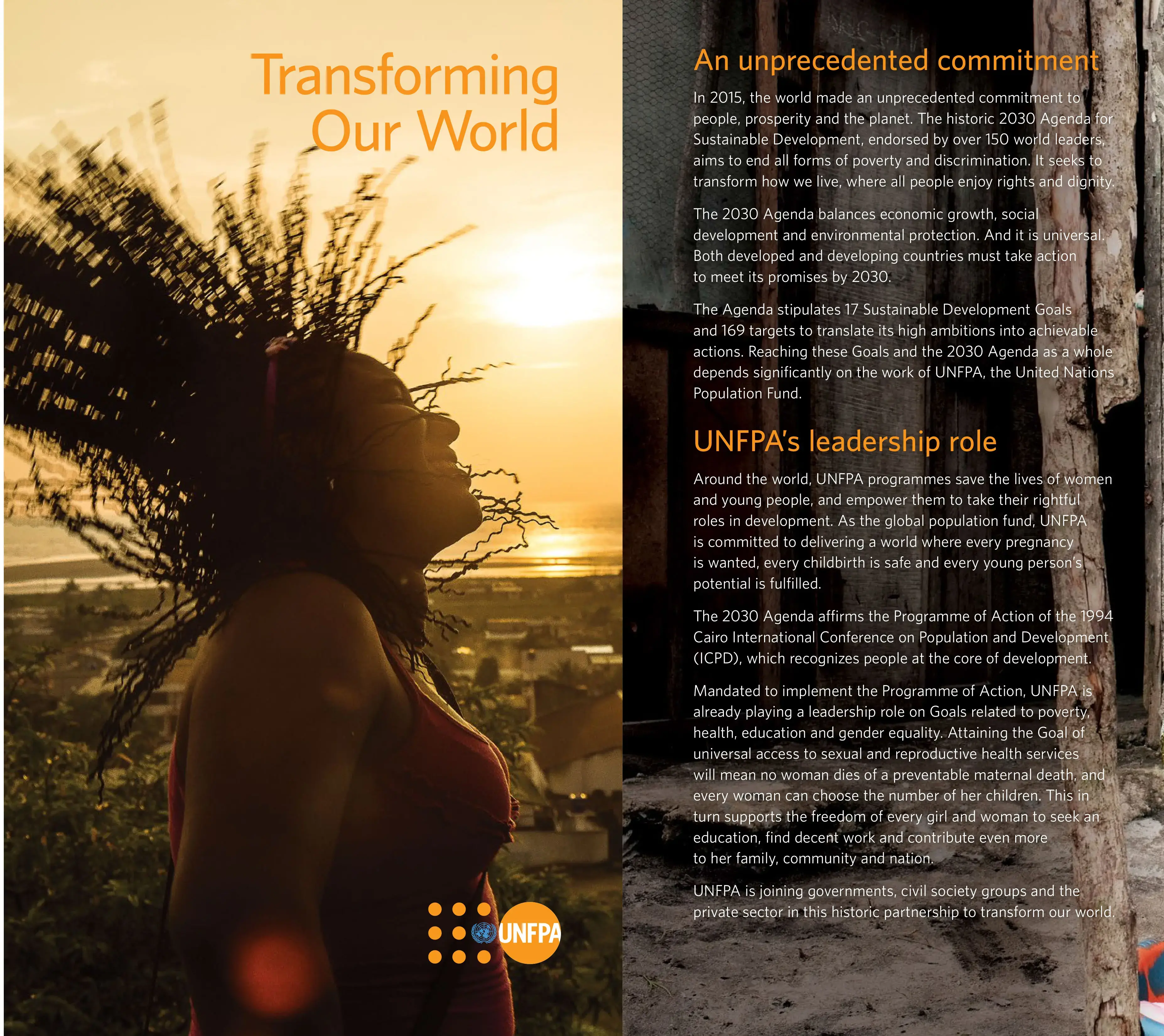 25 September 2015 | Sustainable Development Goals adopted - All 193 UN Member States adopt the 2030 Agenda for Sustainable Development – a shared promise to transform the world in 15 years. The 17 goals echo the values of the ICPD, placing people, dignity and equality at the centre of progress. UNFPA works with governments and partners to drive this agenda forward, with a focus on health, education and gender equality.